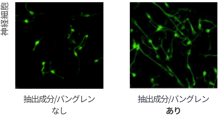 このエキスには、記憶力・学習力の維持に深く関わり脳の神経幹細胞の分化・成長に欠かせない神経栄養因子様活性化合物「バングレン」が豊富に含まれます。