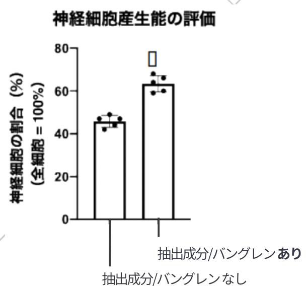 ジャワしょうが抽出成分バングレンの神経幹細胞添加試験の結果、神経幹細胞にジャワしょうがエキスを添加すると、神経細胞への分化と神経突起の成長が示されました。