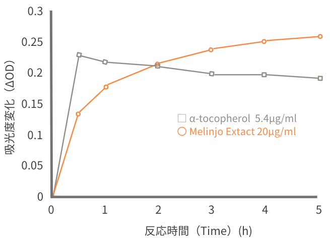 DPPHラジカル消去活性評価法において、ビタミンE(α-トコフェロール)は試験開始から30分後には消去能を失いはじめますが、「メリンジョエキス」は電子をゆっくり放出することで、5時間後でも消去能を発揮しました。